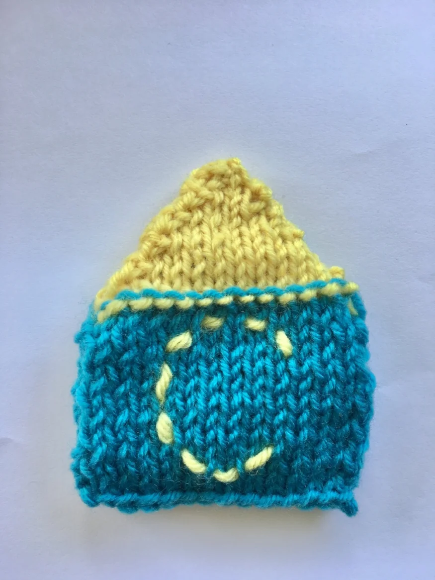In roof colour (yellow - or your choice!) cast on 2 stitches. Leave a long tail (for sewing houses together or for hanging tag).